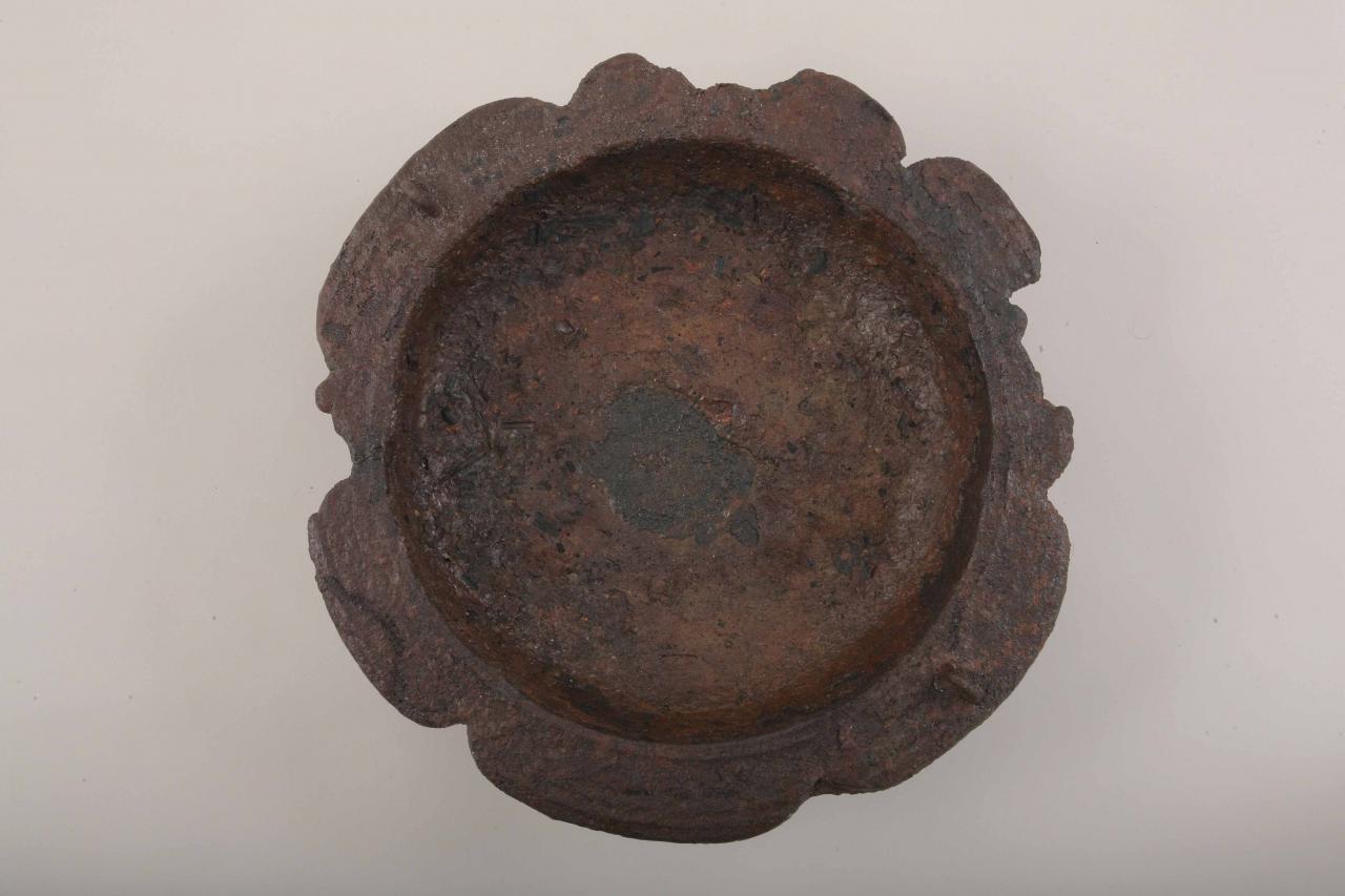ほぼ完形,鉄鋳物,人面脚3足,吊り手2個,湯口丸型,鉄花瓶と共伴