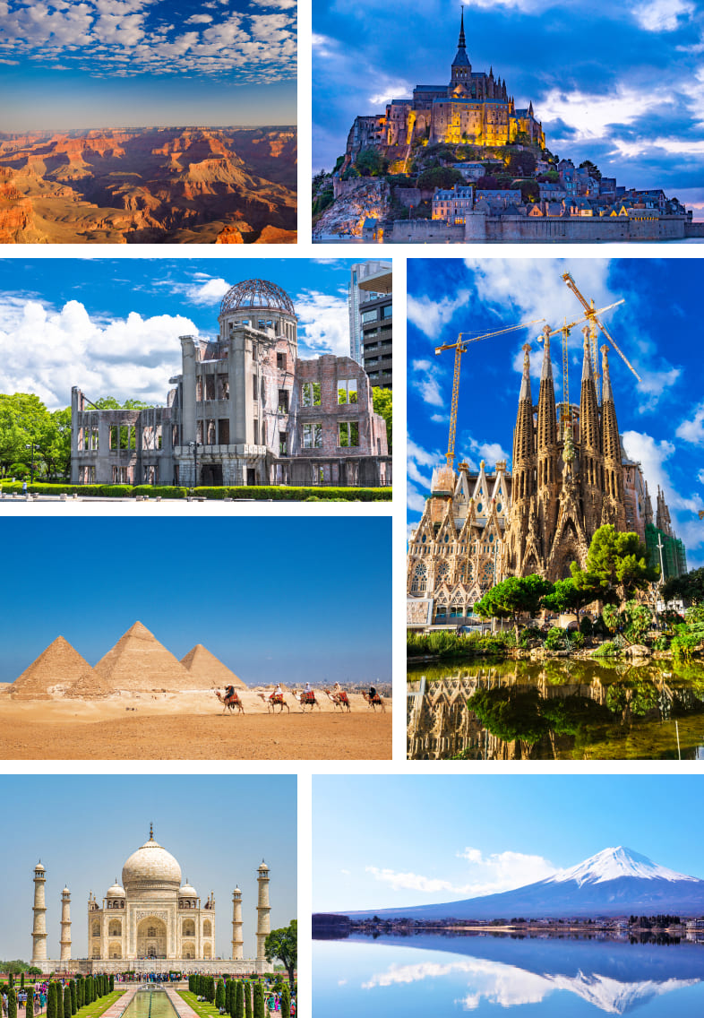 例:法隆寺、原爆ドーム、タージ・マハル(インド)、ピラミッド(エジプト)など